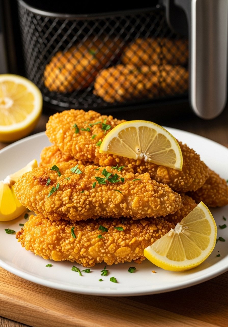 Serve on a platter with honey mustard, ranch, or ketchup and lemon wedges. Garnish with chopped parsley. Pack leftovers in airtight food containers and refrigerate up to 4 days; re-crisp for 3–4 minutes at 350°F before serving. These tenders also freeze well — flash-freeze on a tray, then store in freezer bags.