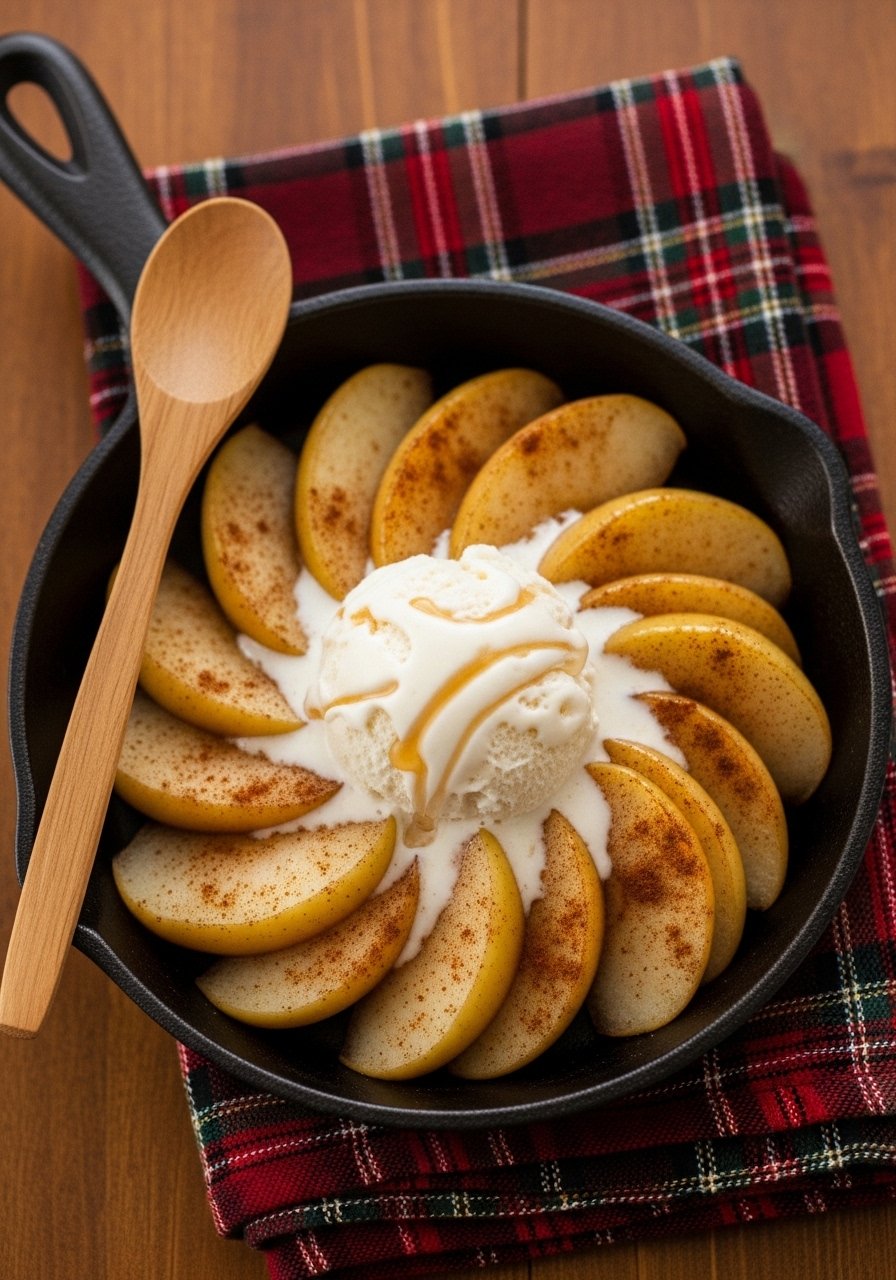 Serve warm in bowls with a scoop of vanilla ice cream and a sprinkle of cinnamon. Use a small cast iron skillet or metal pan to fit your fryer for prettier presentation. Store leftovers in airtight containers up to 3 days; reheat 3–4 minutes at 325°F.