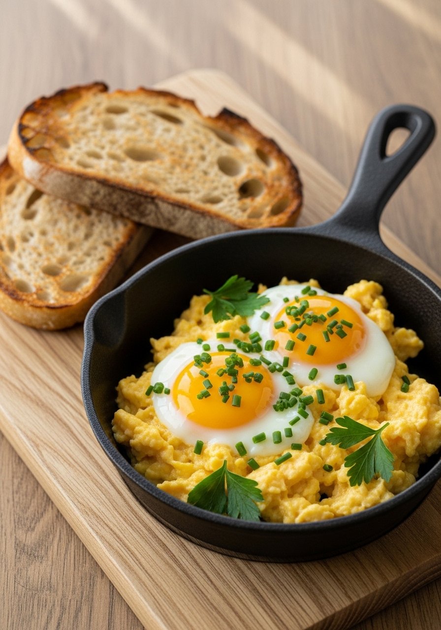 Soft, creamy scrambled eggs depend on gentle heat and patience rather than fancy technique. They’re fluffy with a silky mouthfeel and bright herb notes. This recipe is a quick confidence-builder for anyone starting out in the kitchen.