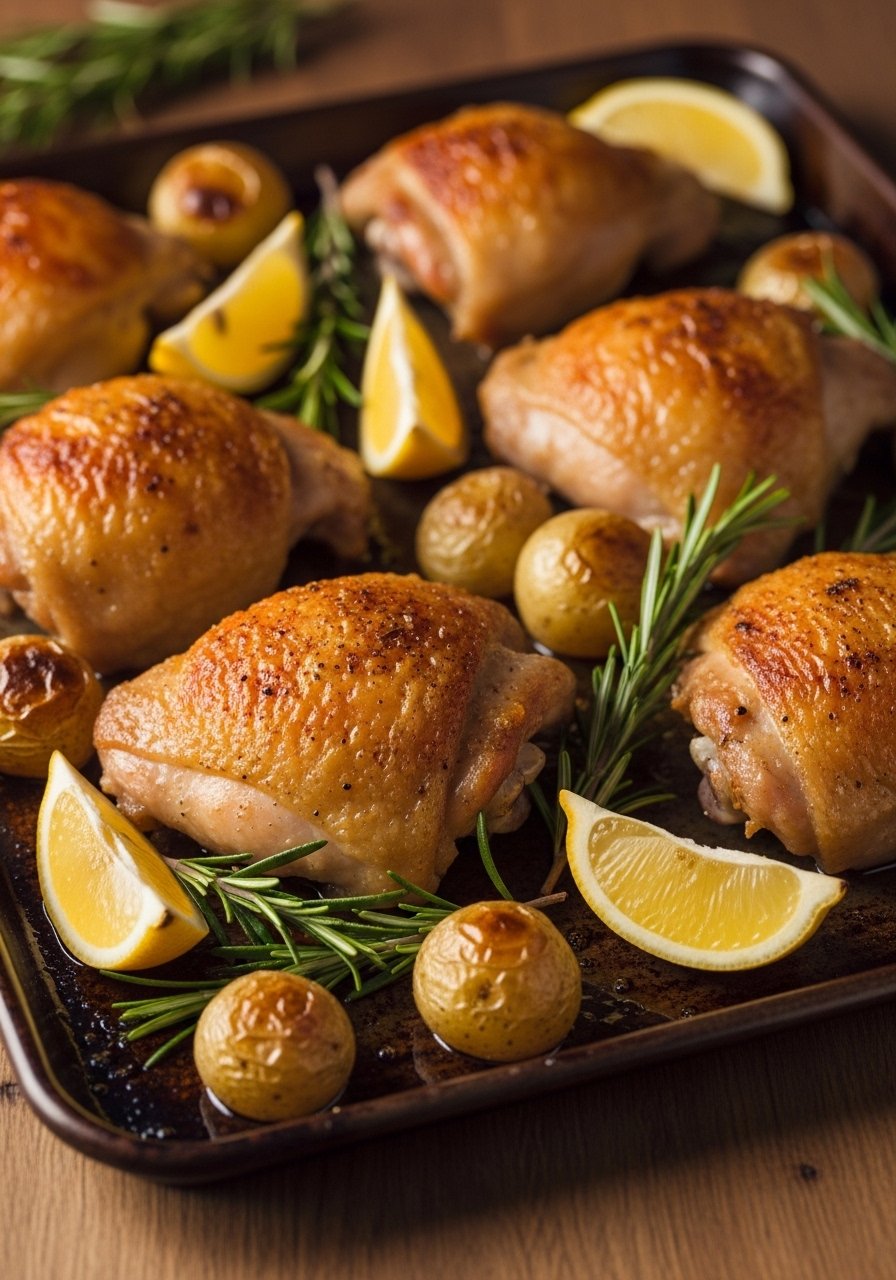 Serve with roasted vegetables and a green salad. Garnish with extra lemon wedges and rosemary. Store leftovers in glass meal prep containers in the fridge for up to 3 days. Reheat gently in a 350°F oven to keep skin texture.