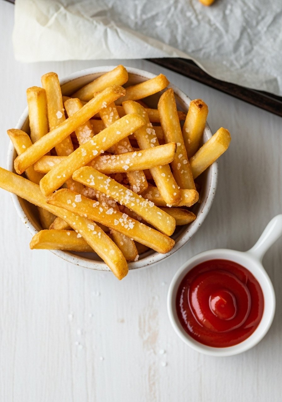 Serve in a bowl or cone with ketchup or garlic aioli. A wire cooling rack helps drain oil before serving. Store leftover fries in the fridge and reheat in an air fryer for best texture.