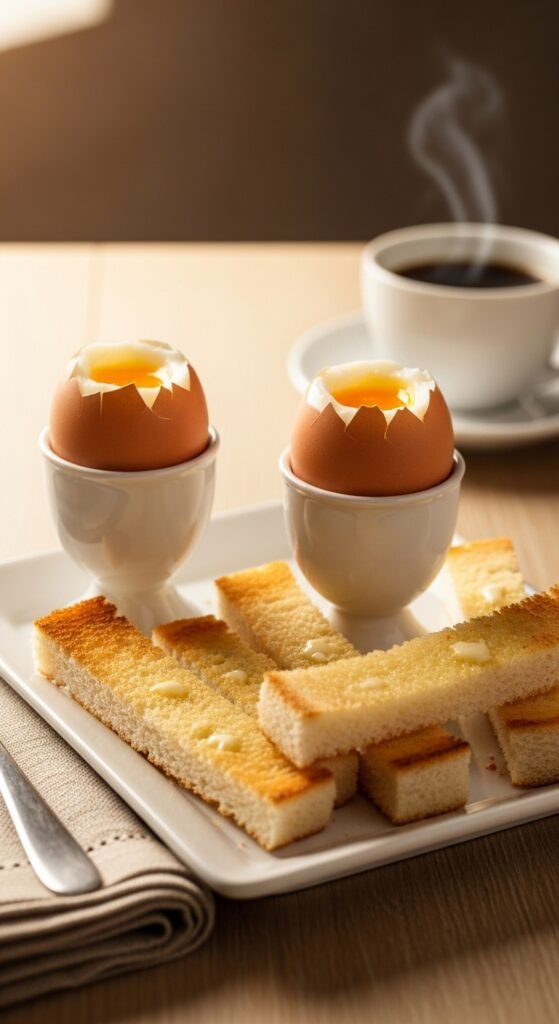 Serve eggs warm in cups. Add salt lightly. Dip toast strips into yolk. Pair with tea. Keep it simple.