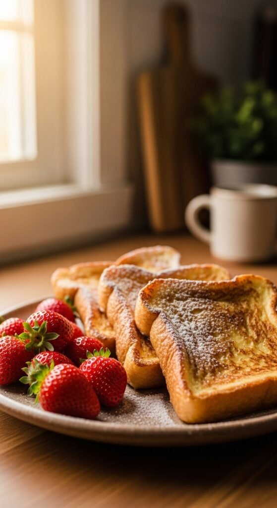 French toast brings comfort with its custardy center and lightly crisp exterior, making it feel indulgent without being heavy. The balance of egg, milk, and spice creates a soft texture that feels familiar and cozy. It works well for both busy mornings and relaxed brunch tables.