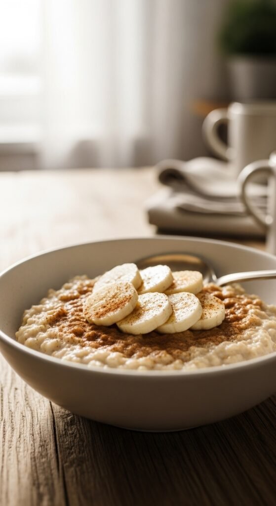 Simmer oats and milk over medium-low heat for 5–7 minutes, stirring often. Add banana and cinnamon near the end.