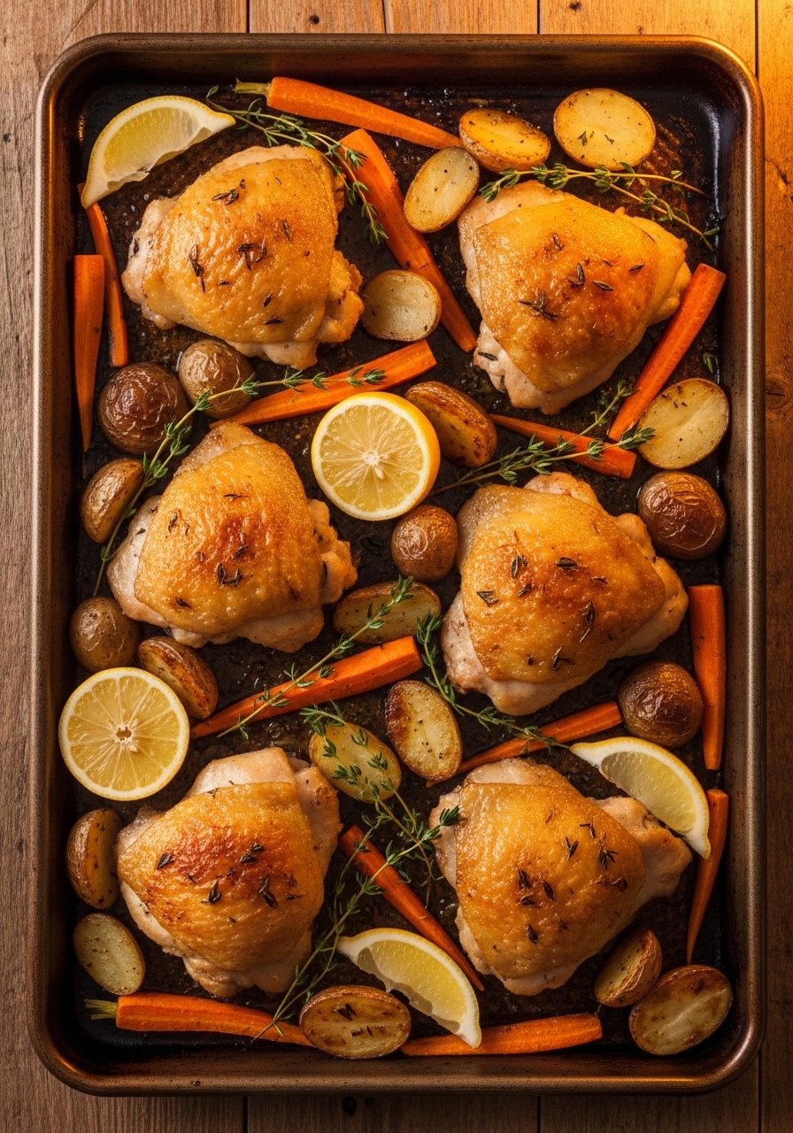 This is the ultimate set-and-forget dinner: juicy chicken thighs roast with crispy potatoes and honey-roasted carrots. The skin caramelizes while the veggies soak up pan juices for a fancy look without fuss. Home cooks who love minimal cleanup will appreciate this.