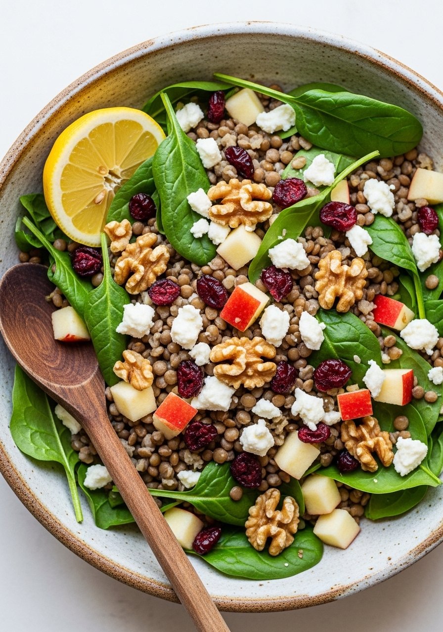 - In a large mixing bowl, combine cooled lentils, spinach, diced apple, cranberries, feta, and walnuts.