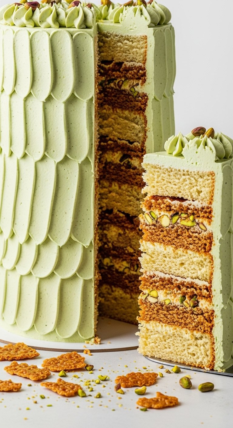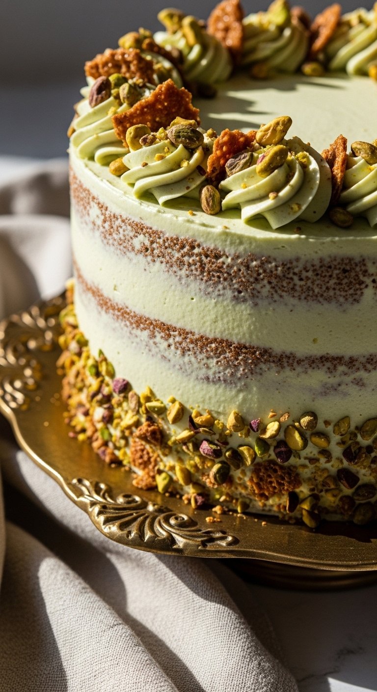 This pistachio layer cake has a delicate green crumb, nutty depth from pistachio paste, and a crunch layer for contrast. The flavor is nut-forward but not cloying, with a silky Swiss-style buttercream that keeps slices neat. Perfect for birthdays or a luxe afternoon tea, it smells of toasted nuts and brown butter if you choose to brown it. Home bakers who love texture and refined flavors will adore this recipe.