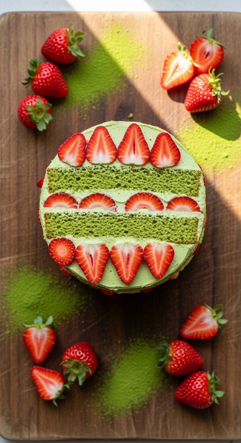 Earthy matcha pairs beautifully with bright, slightly tart strawberries in this modern fusion cake. The batter is light and sponge-like, while whipped matcha buttercream keeps sweetness in check. This is a great spring centerpiece — it looks fresh and smells of green tea and berries. If you love subtle grassy notes that meet fruit, this matcha cake recipe will become a go-to.