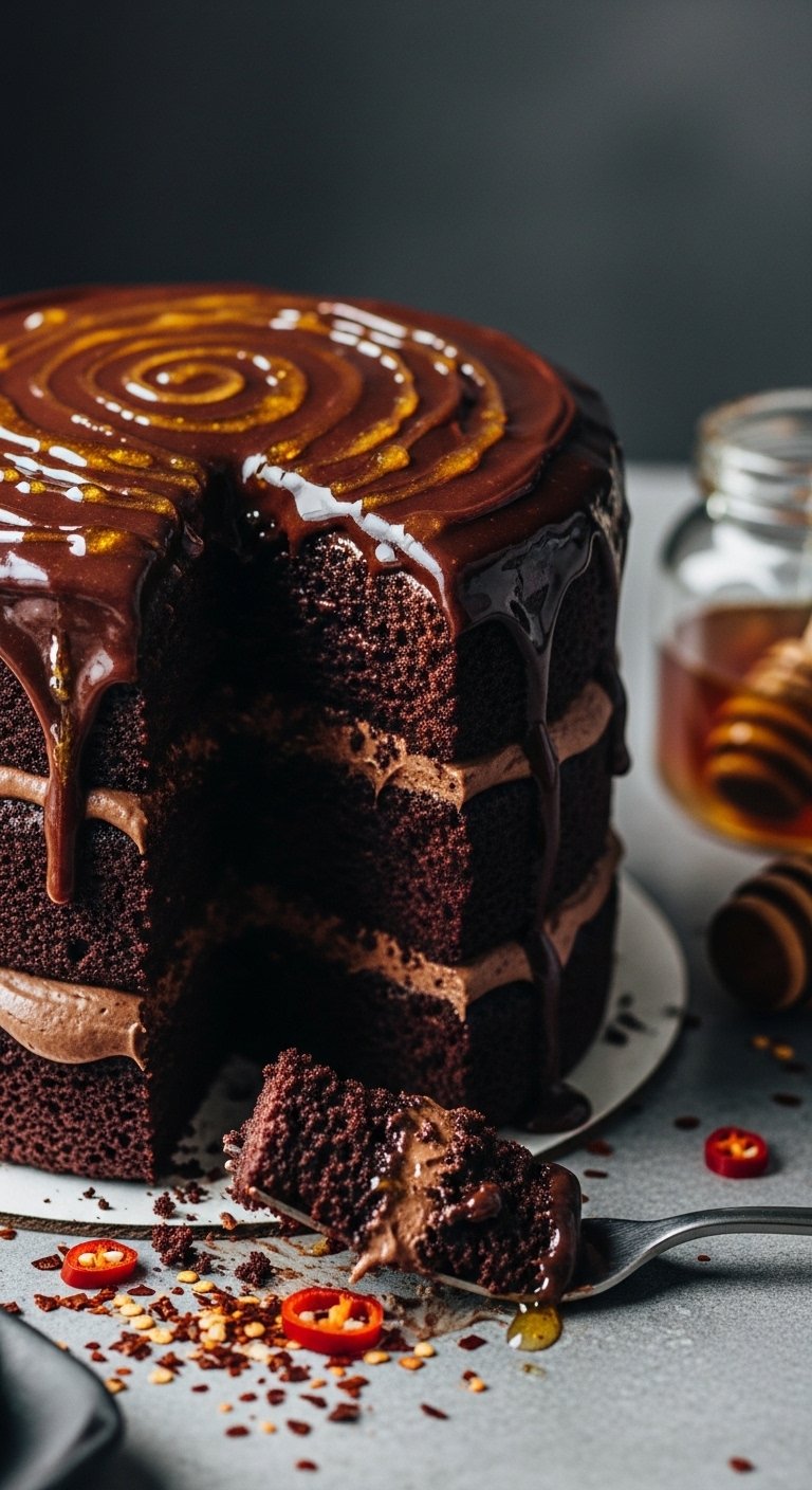 This chocolate cake brings the “swicy” trend to dessert: rich cocoa with a warming streak of chili and a sticky hot honey glaze. The chocolate base is tender with a slight chew from espresso in the batter, and the ganache is silky with a back-of-the-throat heat. People who like bold contrasts — sweet, bitter, and spicy — will love this cake.