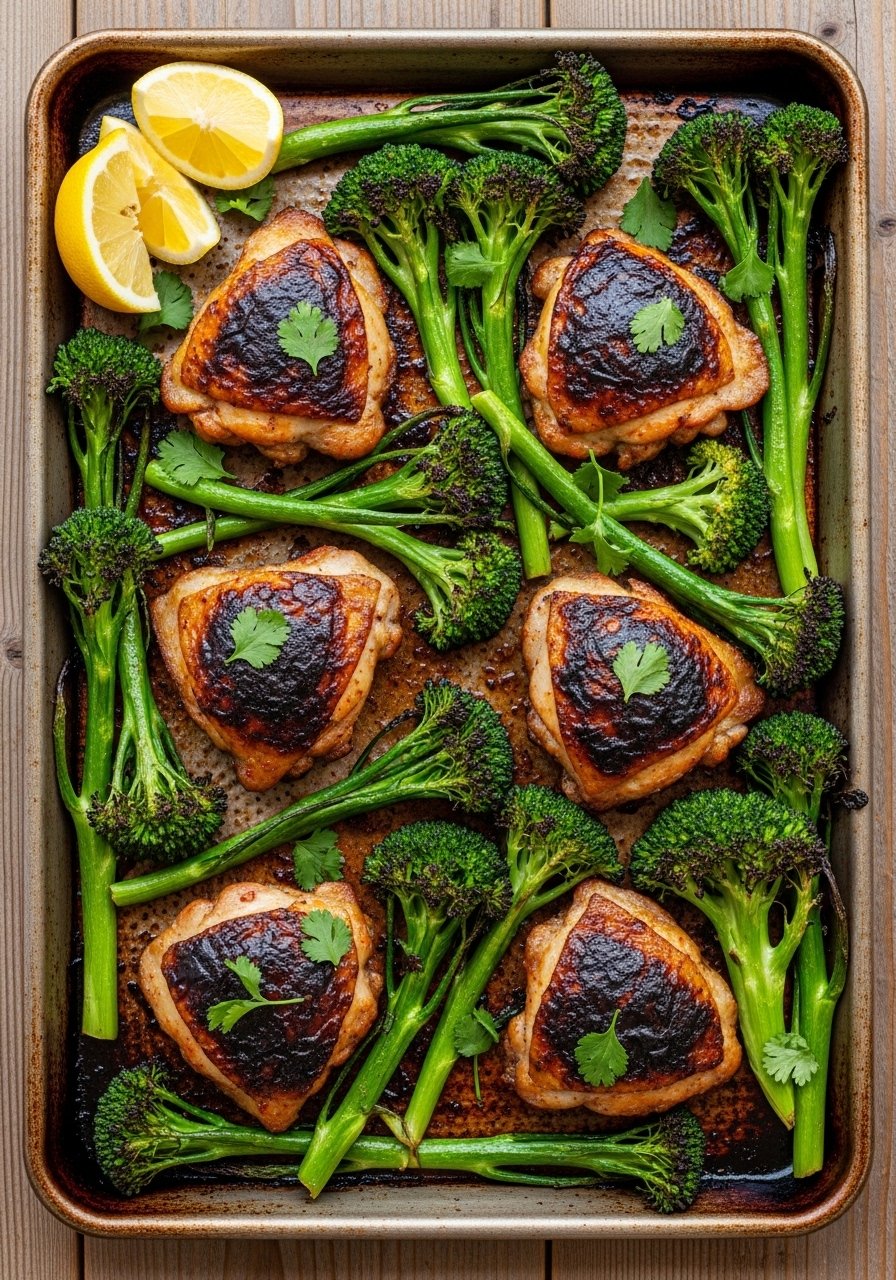 4. Roast 18–22 minutes, flipping broccoli halfway, until chicken reaches 165°F and broccoli is tender with charred tips.