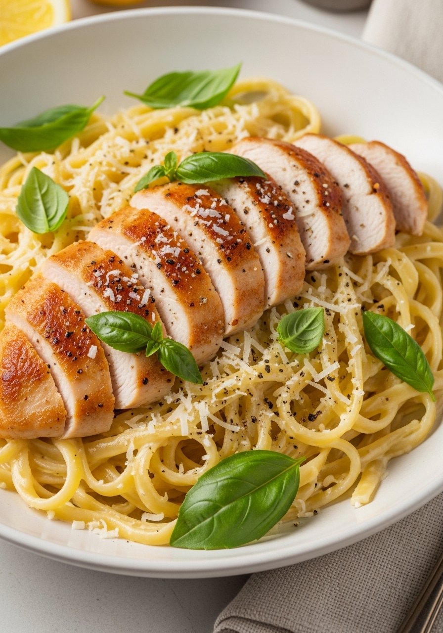 This creamy lemon pasta hits rich and fresh notes at once. Thinly sliced chicken breasts sear to a golden crust and finish in a silky lemon-Parmesan sauce that clings to pasta. It's a classic weeknight pasta that never dries out because the chicken rests in the sauce to stay juicy.