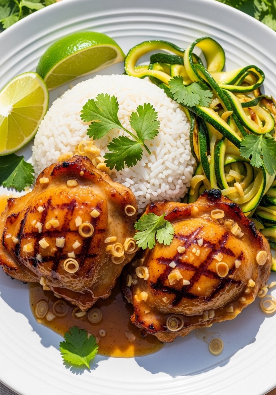 Spoon coconut rice onto plates, top with chicken and zucchini, and drizzle sauce. Garnish with cilantro and extra lime wedges. Store leftovers in airtight containers for 3 days; reheat in a skillet for best texture. This chicken recipe brings Southeast Asian flavors to your weeknight menu.