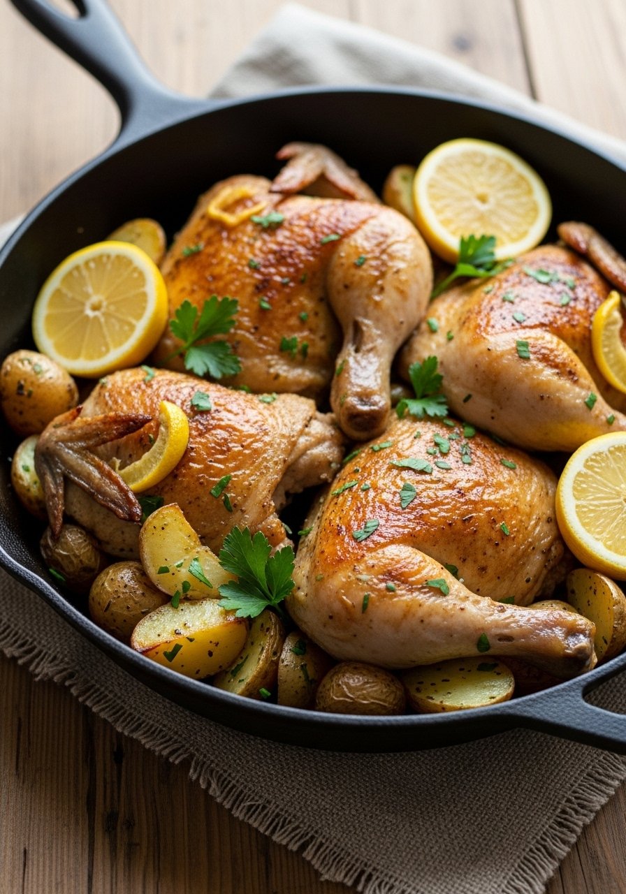 Serve straight from the skillet for rustic appeal. Garnish with extra lemon wedges and chopped parsley. Pair with a crisp green salad or steamed green beans. Leftovers keep well in airtight containers for up to 3 days—reheat gently in a skillet to bring back crispness. If you’ll be roasting often, a silicone hot handle cover helps when bringing the skillet to the table.