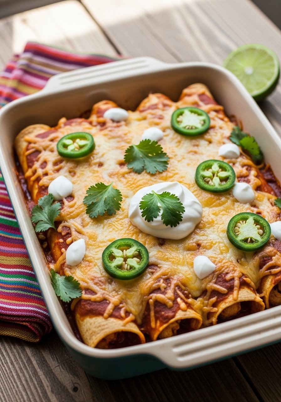 These chicken enchiladas are saucy, cheesy, and forgiving—exactly what you want from freezer meals. The filling is seasoned shredded chicken with a touch of cumin and lime, wrapped in tortillas and smothered with enchilada sauce and cheese. They bake up bubbly and golden, smelling warm and Mexican-spiced. Busy families and meal-preppers will love that they reheat evenly without drying out.