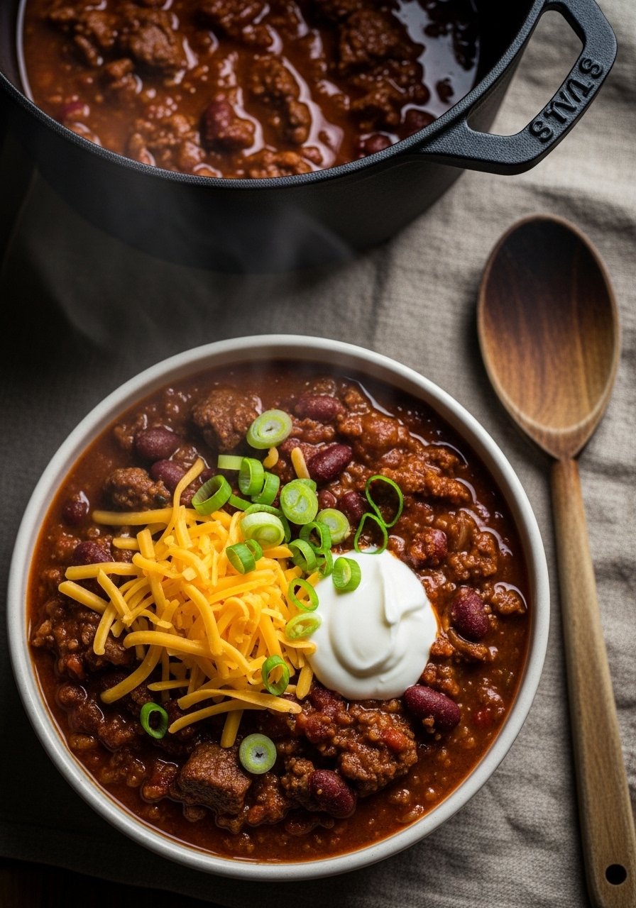 Top with shredded cheddar, sour cream, chopped scallions, and cornbread on the side. Make-ahead bowls freeze for up to 3 months in glass meal prep containers. For parties, serve in a slow cooker on low to keep warm. This chili pairs well with a crisp green salad or tortilla chips.