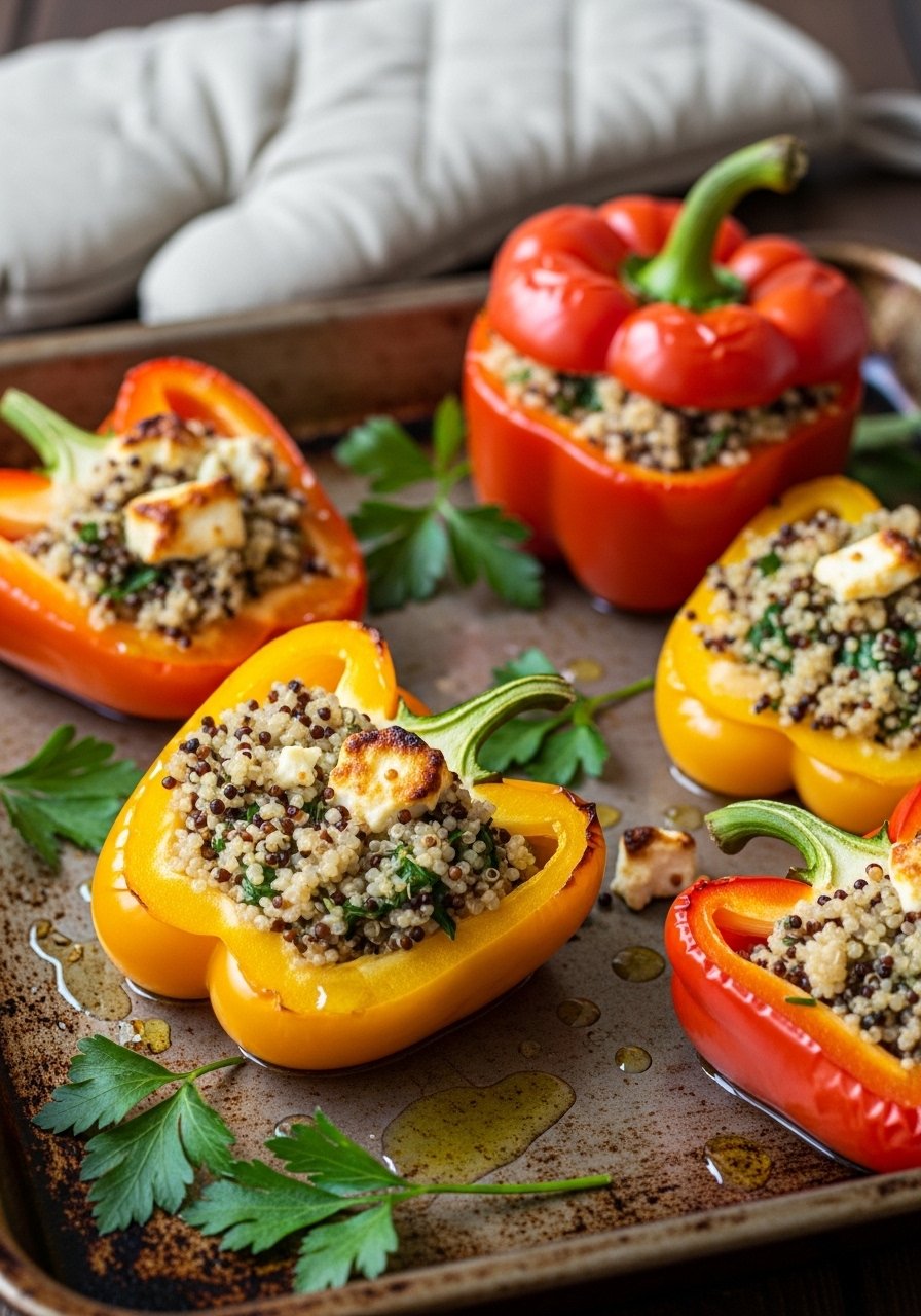 These stuffed peppers are vibrant, savory, and naturally gluten-free. A base of fluffy quinoa, sun-dried tomatoes, herbs, and feta gives great mouthfeel and satisfying bites. They’re easy to prep ahead and bake when dinner time hits.
