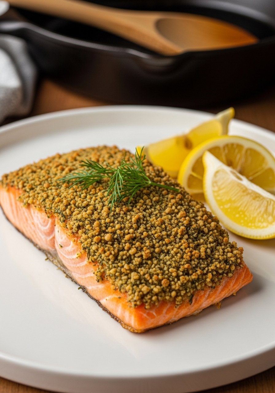 Crispy herb crust gives salmon a crunchy, fragrant top while the inside stays tender and flaky. Breadcrumbs are swapped for a nutty gluten-free panko alternative or finely chopped almonds for structure and crunch. This comes together in 20 minutes.