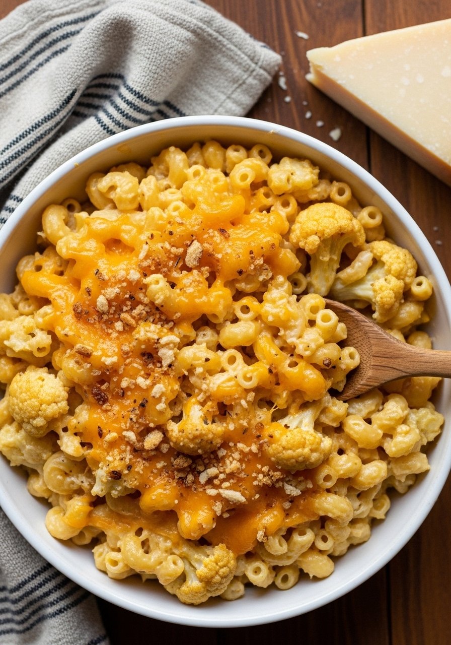 - Combine pasta, cauliflower, and cheese sauce in a baking dish. Toss to coat evenly.