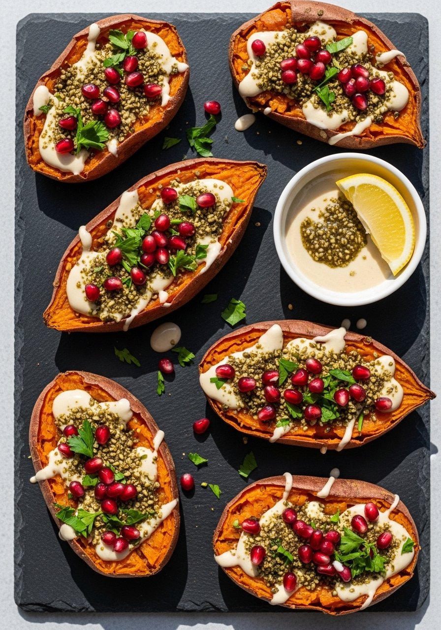- Top each smashed potato with tahini, pomegranate seeds, pumpkin seeds, herbs, and a sprinkle of za’atar.