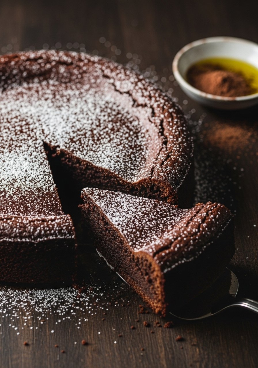 Dense, rich, and intensely chocolatey, this flourless cake relies on eggs and good chocolate rather than gluten. The olive oil gives it a silky crumb and a bright finish. It’s elegant enough for guests but simple to make.
