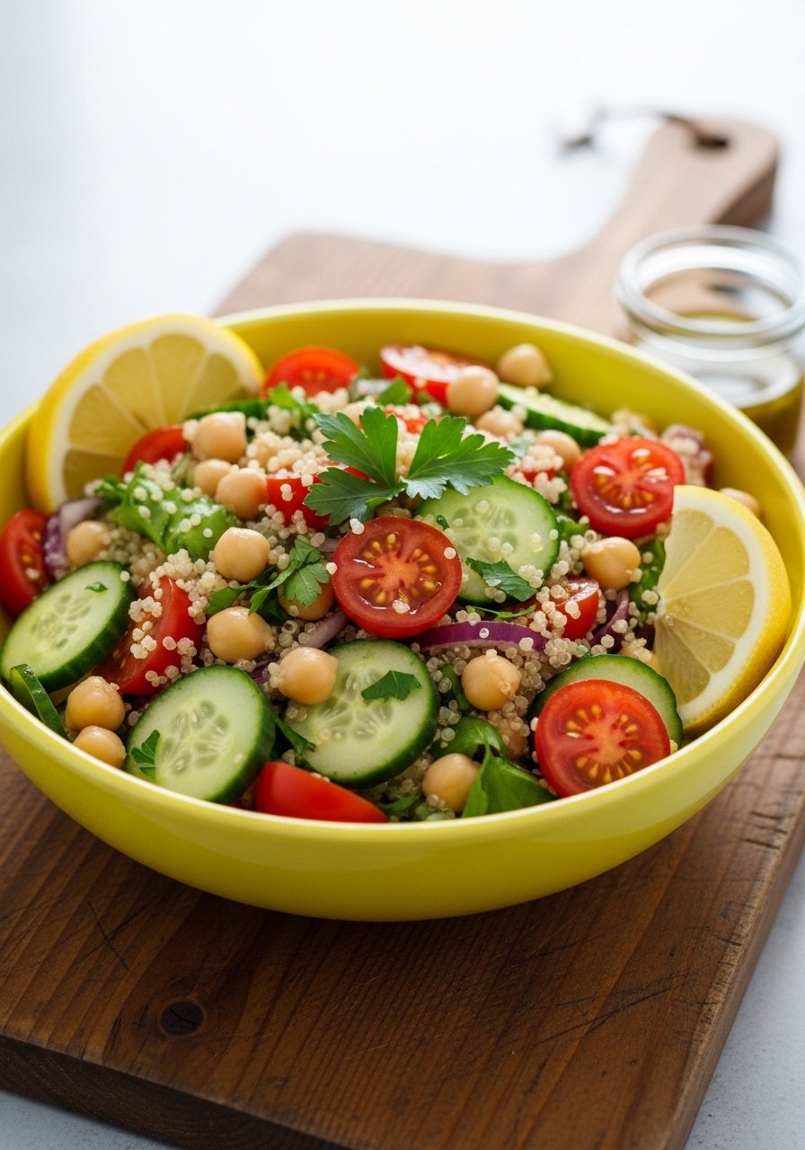 This salad layers nutty quinoa with protein-rich chickpeas and crisp veggies for crunch. The lemony dressing keeps the flavors bright, and chopped parsley lends herbaceous freshness. It’s ideal for a work lunch or potluck because it holds up well and tastes better after a short chill.
