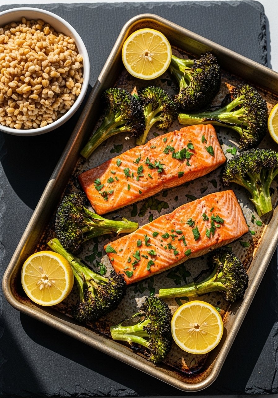 This sheet-pan meal combines chewy farro, tender roasted broccoli, and flaky salmon for a balanced plate rich in fiber and omega-3s. The salmon gets a garlicky lemon crust while broccoli roasts to caramelized edges—great for a weeknight dinner that feels special.