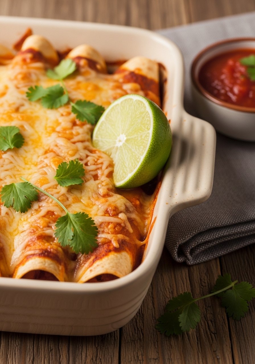 - Bake 18–22 minutes until sauce is bubbling and cheese is melted and golden. Garnish with chopped cilantro and lime wedges.