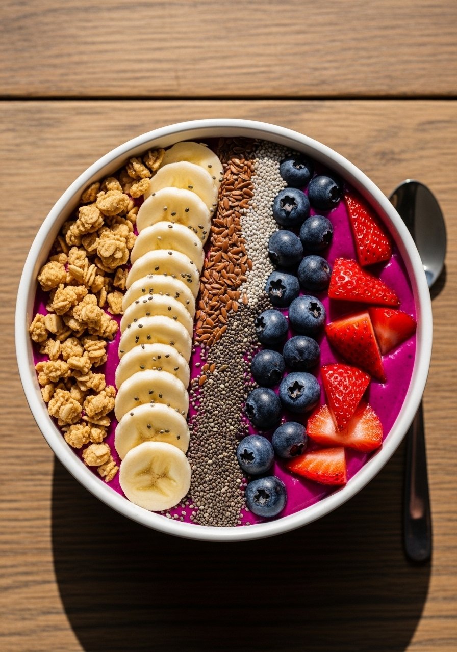 - Arrange toppings artfully: banana slices, granola, pumpkin seeds, and extra berries.