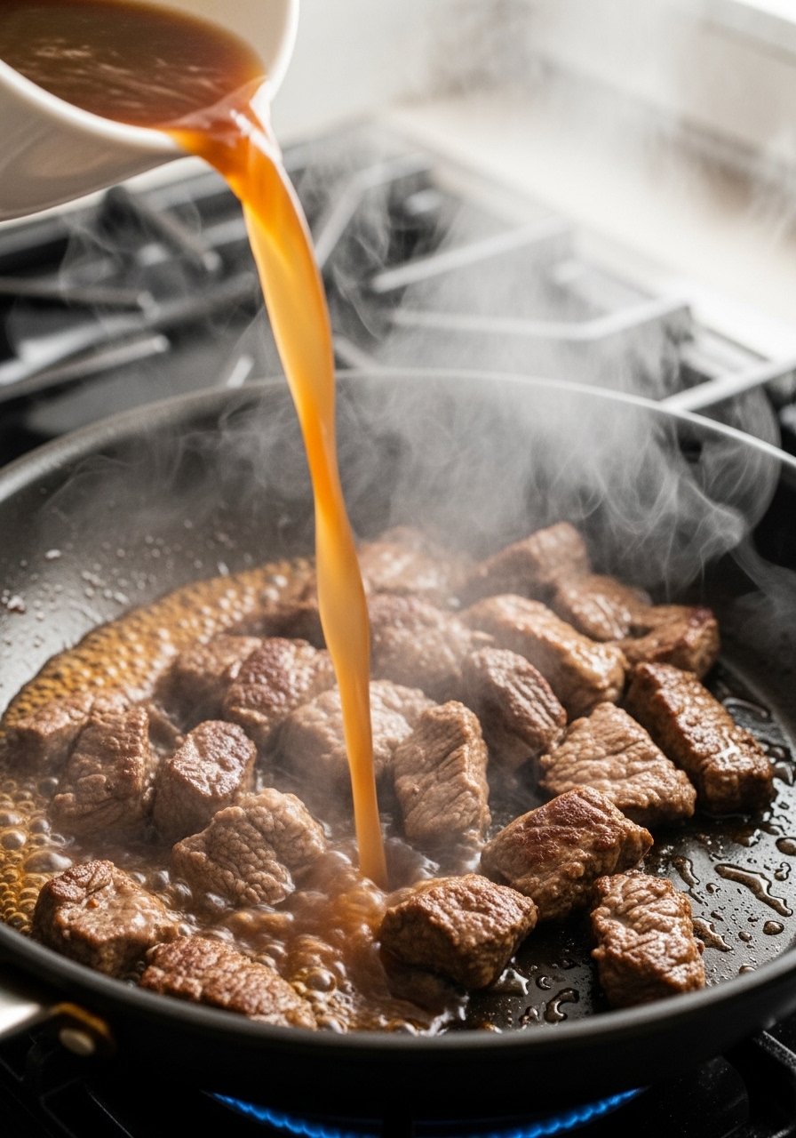 - After browning, add 1 tbsp Worcestershire sauce and 1/4 cup beef broth, scraping browned bits.