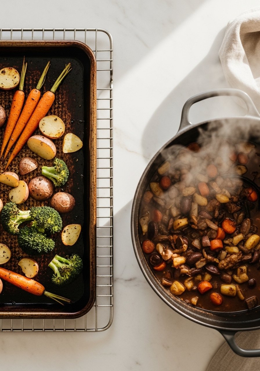 • Sheet-pan roast: preheat to 425°F, spread veggies in a single layer, roast 20–25 minutes until crispy golden edges appear. Use a silicone baking mat to prevent sticking.