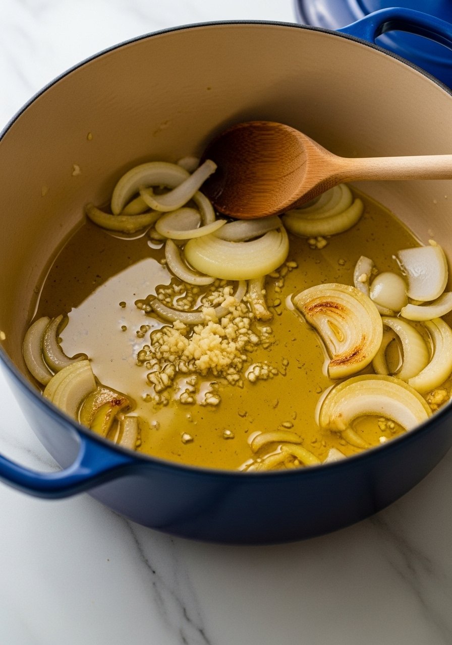 - Sauté aromatics: heat 1 tbsp olive oil in a heavy-bottom pot, cook 1/2 cup chopped onion until translucent.