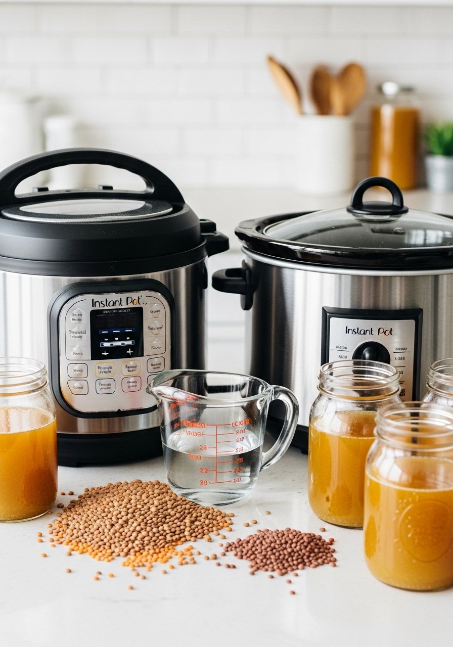 - Slow cooker: Use 2.5–3 cups liquid per cup lentils, cook on low 4–6 hours. Great for soups where you want fall-apart lentils.