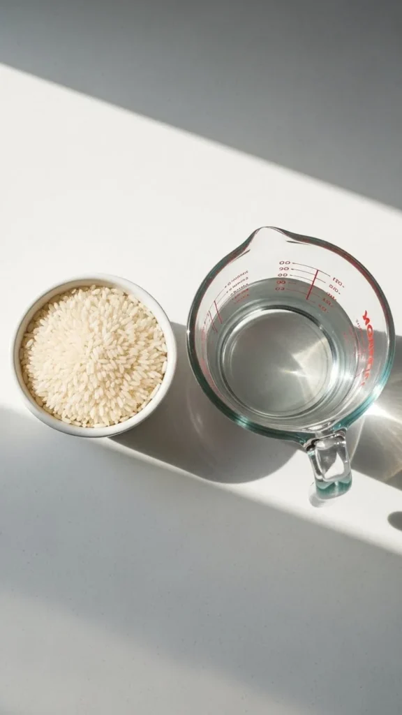 - White long-grain rice: 1 cup rice → 1½ cups water