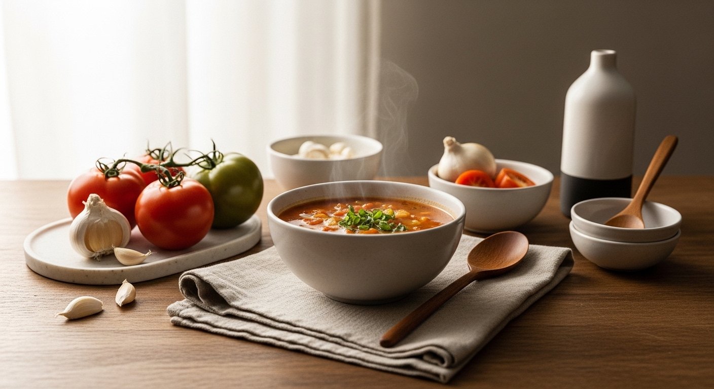 - Roast aromatics for depth: halve 6–8 Roma tomatoes and a whole bulb of garlic, toss with 2 tbsp olive oil and salt. Roast at 425°F for 35–45 minutes until edges brown. Roasting adds the caramelized “roasted depth” that makes cheap ingredients taste gourmet (roasted tomato soup costs about $2/serving).