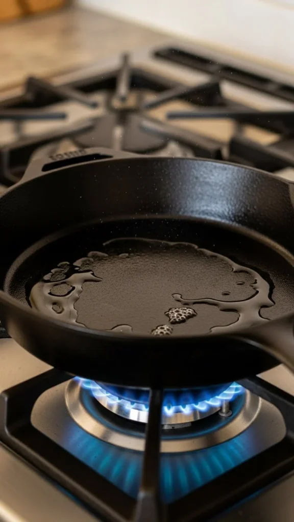 Heat the pan on medium-high until it’s very hot—hot enough that a drop of water sizzles instantly.