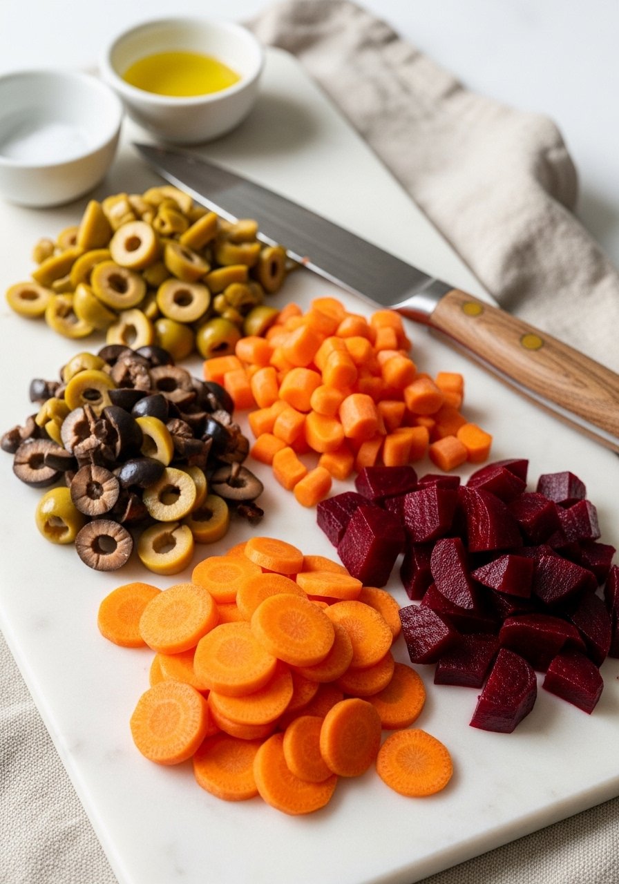 - Cut vegetables into uniform pieces so they cook evenly—aim for 1–1.5-inch chunks for roots, and halved Brussels sprouts or thicker slices for squash.
