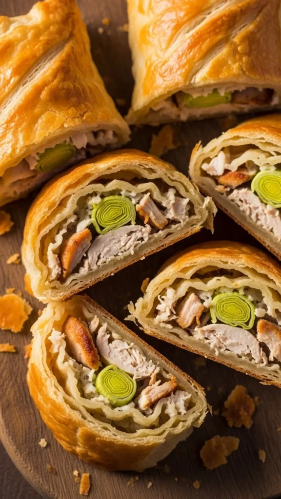 These rolls combine tender chicken, soft leeks, and a creamy sauce inside crisp pastry, making them a comforting yet easy-to-eat party dish.