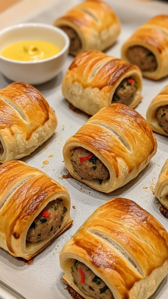 These sausage rolls feature seasoned Irish-style sausages wrapped in buttery pastry, creating a crowd-friendly snack with crispy layers and savory flavor in every bite.
