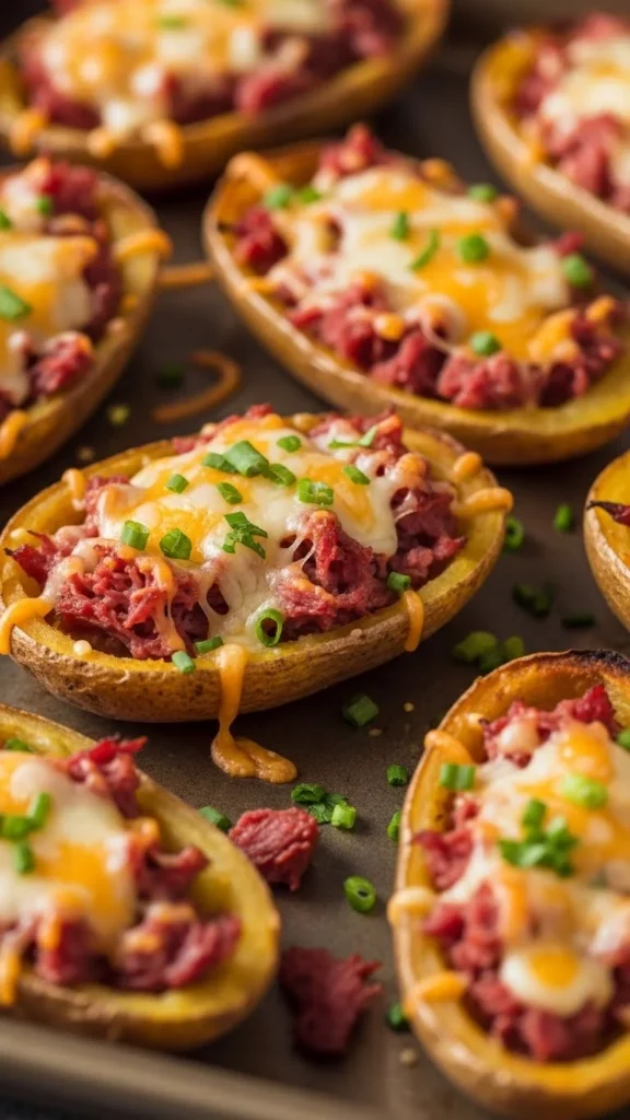 These loaded potato skins bring together the salty richness of corned beef and the comforting crispiness of baked potatoes, making a fun and filling party snack.
