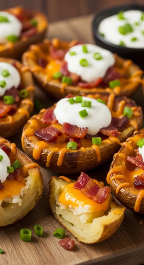 Top with sour cream and chopped green onions before serving. These potato skins make a great appetizer or side dish, and they’re fantastic when paired with a fresh salad or hearty soup.