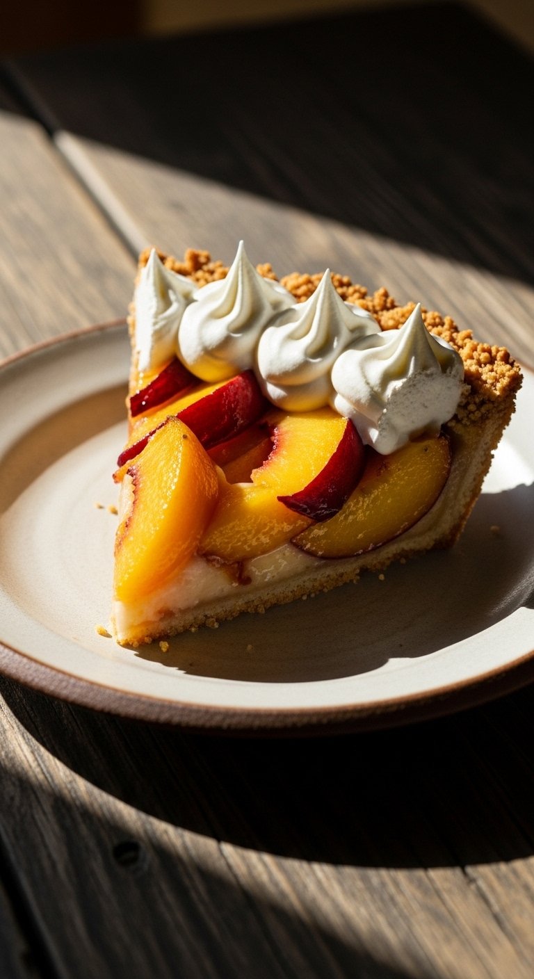 - Toss peach slices with lemon juice. Spread a thin layer of the cream into the crust, add a layer of peaches, then more cream until filled.