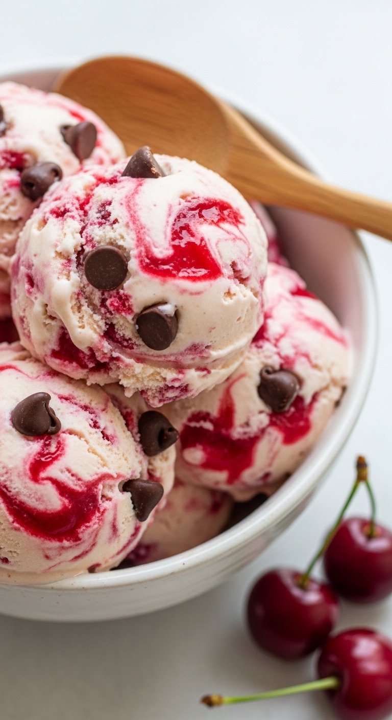 No ice cream maker? No problem. This no-churn cherry chocolate chip ice cream is rich, creamy, and studded with tart cherries and dark chocolate. It freezes firm but scoops nicely if you let it sit at room temp 5–10 minutes. A handheld mixer makes whipping the base quick and easy.