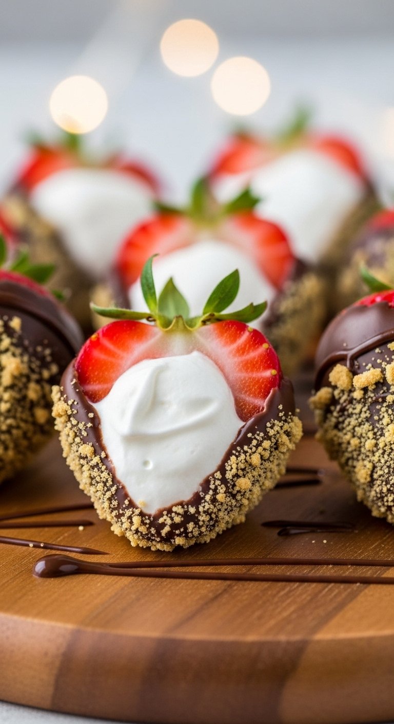 - Dip the filled strawberries halfway into melted chocolate and immediately sprinkle crushed graham crumbs on the chocolate.
