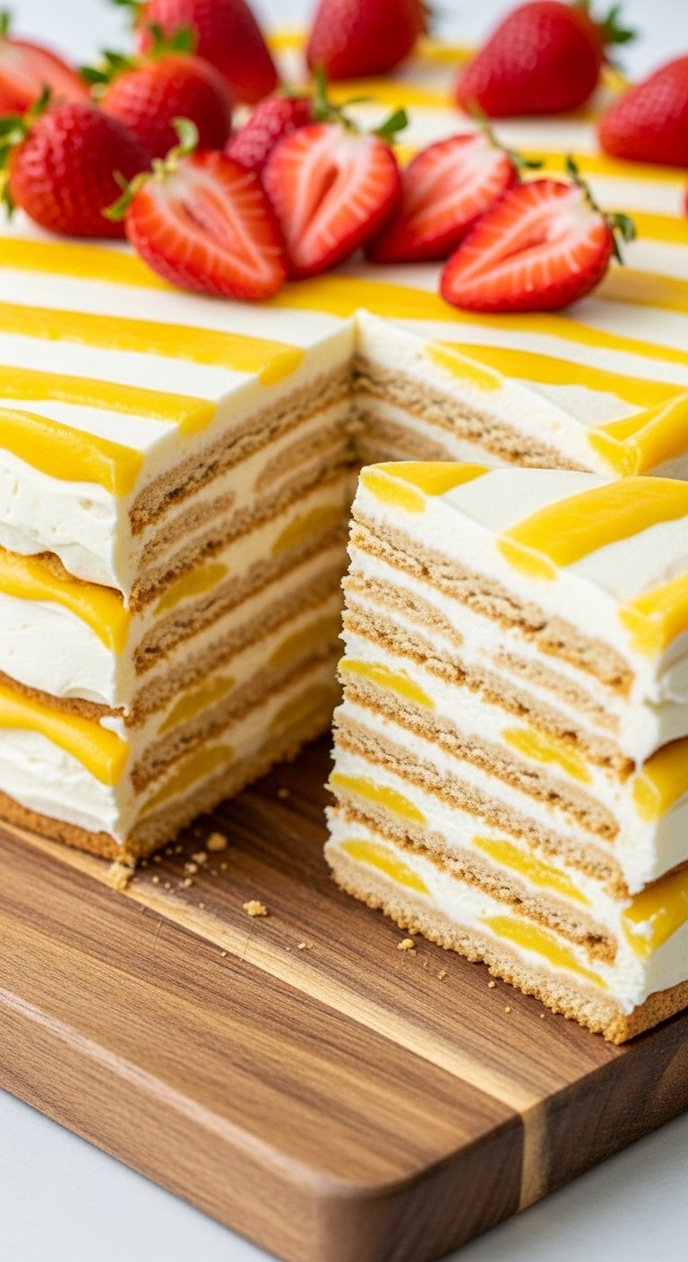 - Layer graham crackers to cover, then spread with filling, dot lemon curd, and add sliced strawberries. Repeat layers until pan is full, ending with filling.