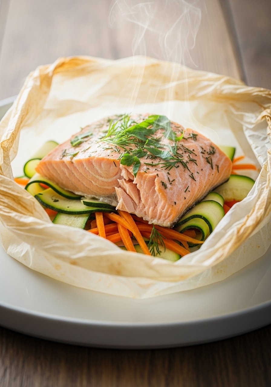 Baking salmon en papillote (in parchment) traps steam and aromatics, producing tender, fragrant fillets with zero fishy taste. It’s virtually hands-off and great for portion control. Each packet steams the fish with lemon and herbs for bright flavor.