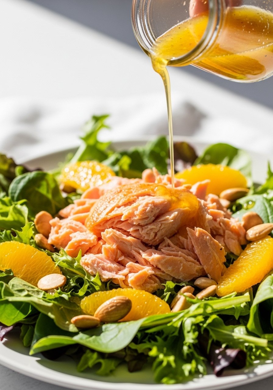 This salad combines citrus and smoked paprika to brighten and balance salmon. The vinaigrette adds acidity and almonds provide crunch—ideal for a healthy lunch or light dinner that removes any heavy fishy notes.