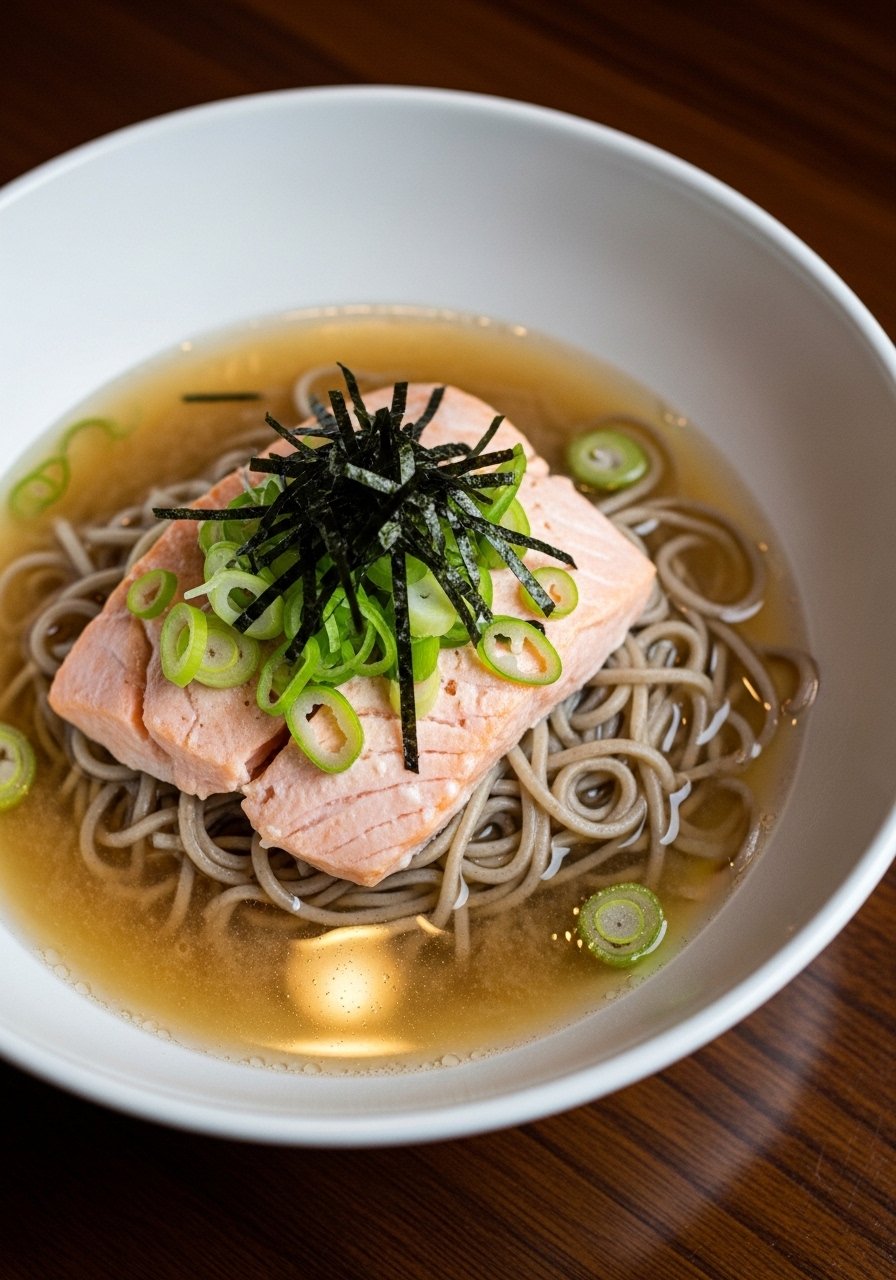 - To serve, place soba in bowls, top with a salmon portion, ladle warm miso broth, and finish with nori and a drizzle of sesame oil.