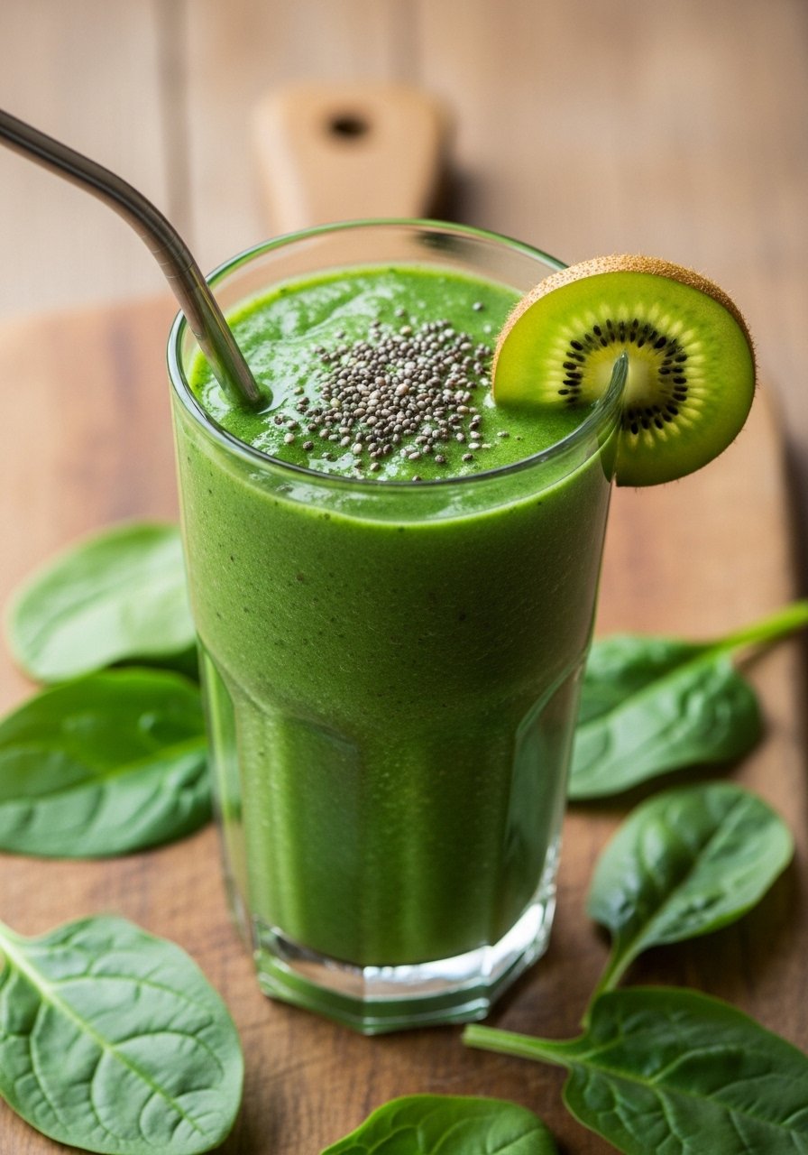 Serve in a chilled glass with a metal reusable straw and a thin kiwi wheel as garnish. Pair with a boiled egg or whole-grain toast for extra protein. Make-ahead: blend without ice and store in mason jars for up to 24 hours—shake before drinking. If prepping greens ahead, store washed spinach in airtight containers.