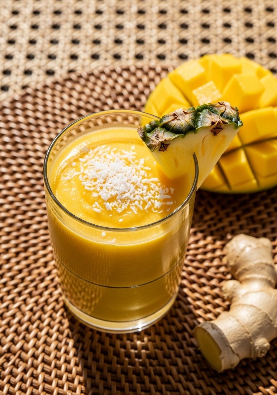 This tropical blend tastes like sunshine and packs vitamin C from mango and pineapple. A small piece of fresh ginger adds warmth and a mild kick that wakes up your palate. Coconut water keeps it light while offering electrolytes for busy mornings after late nights or workouts.