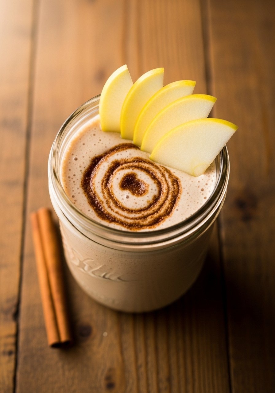 Serve with a thin apple fan and cinnamon stick. Pair with a slice of whole-grain toast for extra fiber. Store in a bottle with lid up to 12 hours; shake before drinking. Use a peeler to get tidy apple slices for garnish.